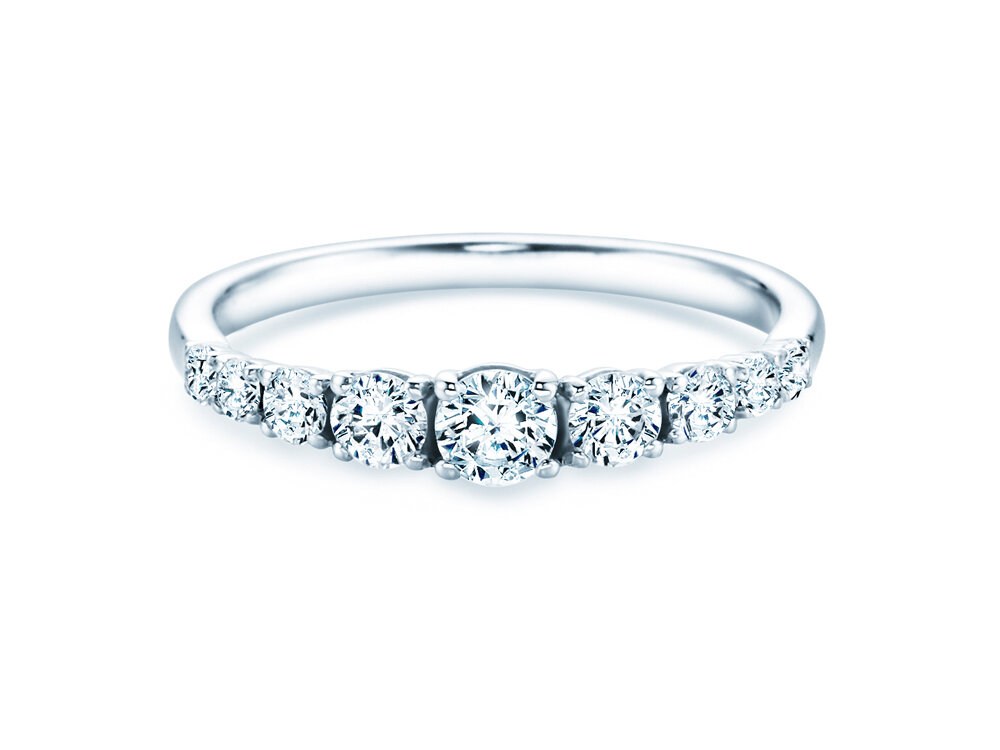 Le modèle élégant et équilibré 9 Diamonds est serti avec neuf diamants brillants de taille différente, qui grandissent lors du rapprochement vers la moitié supérieure du rail. Un bijou stupéfiant sur chaque main, peut être combiné parfaitement avec d'autres bijoux et est au même temps un bijou classique moderne.