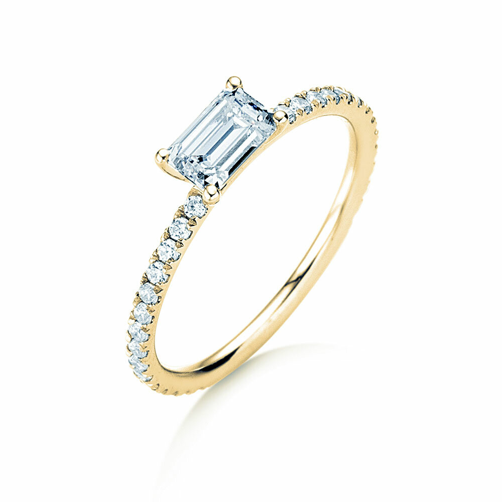 La bague de fiançailles Emerald Cut présente un design filigrane. Vous pouvez choisir la taille du diamant à partir de 0,20 carats. Des diamants en pavé comptant 0,24 carats en tout ornent le canal de l'anneau forgé avec précision.