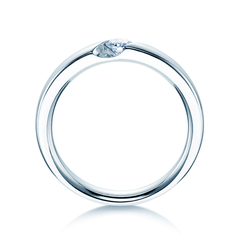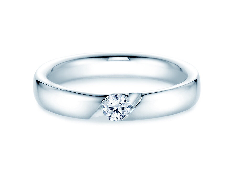 Une bague tension sobre et élégante, classique à première vue. On remarque le raffinement du modèle Italic en le regardant de plus près : solidement niché dans le serti en diagonale, son diamant brille de mille feux grâce à la lumière pénétrant par les côtés ouverts de l'anneau.