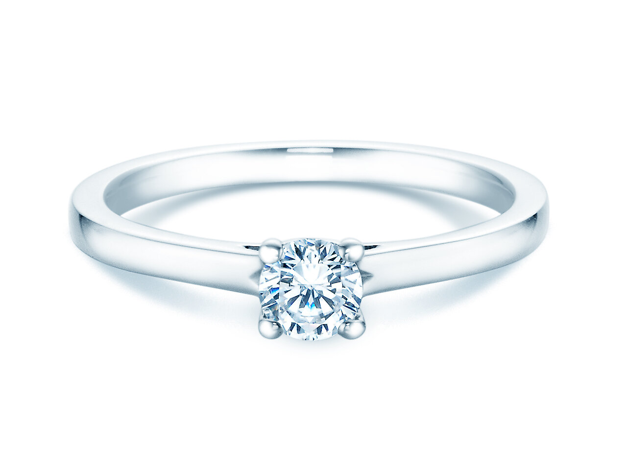 Bague de fiançailles Romance avec chaton à 4 griffes et diamant véritable. Le point fort de la bague solitaire Romance se trouve dans sa sertissure en forme de cœur.