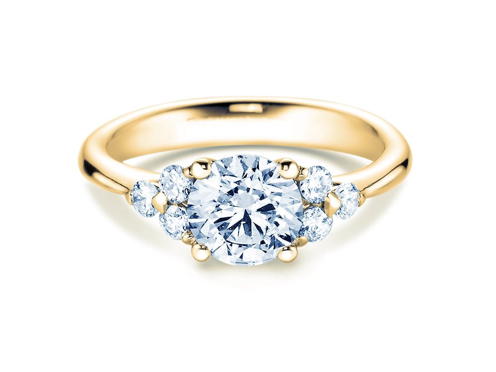 L'anneau poli brillant s'ouvre sur une sertissure magnifique ornée de sept diamants étincelants. Des petits diamants flanquent les deux côtés de l'imposante pierre centrale. Bague de fiançailles Vivid : l'alliance de la lumière et du charme féminin.