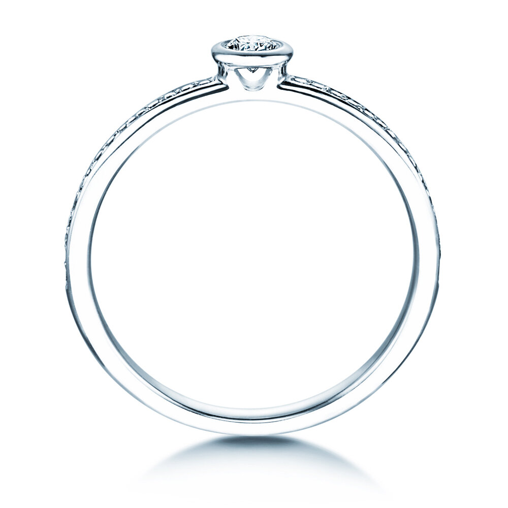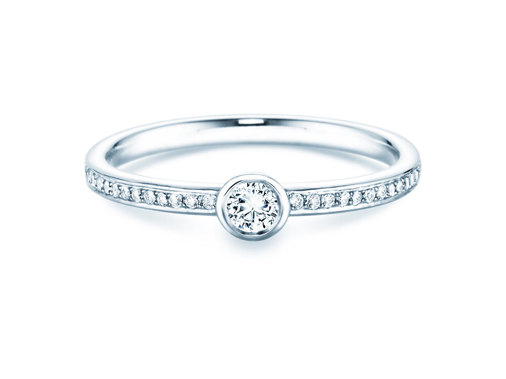 Le rayonnement étincelant de cette ligne de diamants précieux se développe sur toute la partie supérieure du rail poli, doucement arrondi dans l'intérieur. La monture simple et classique avec le serti clos soutient un majestueux diamant et forme ainsi un ensemble harmonieux.