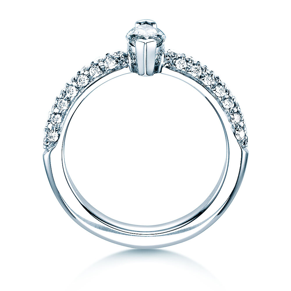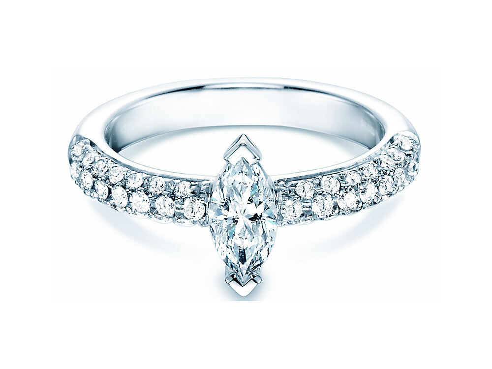 Or blanc 18 carats avec diamant taille marquise. L'origine de la taille marquise se situe à l'époque de Louis XIV. La taille marquise dégage une expressivité particulière. Une bague créée pour une femme d'une beauté et d'une originalité uniques.