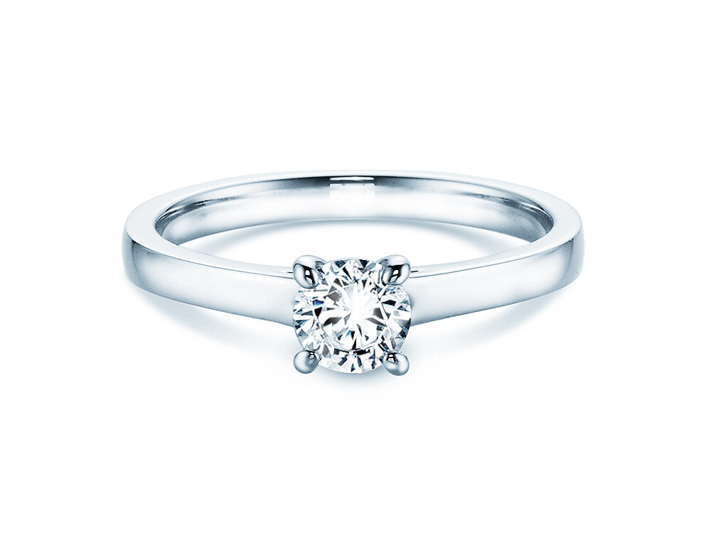 Découvrez maintenant nos bagues de fiançailles Moderns avec un diamant solitaire et serti avec quattre griffes.