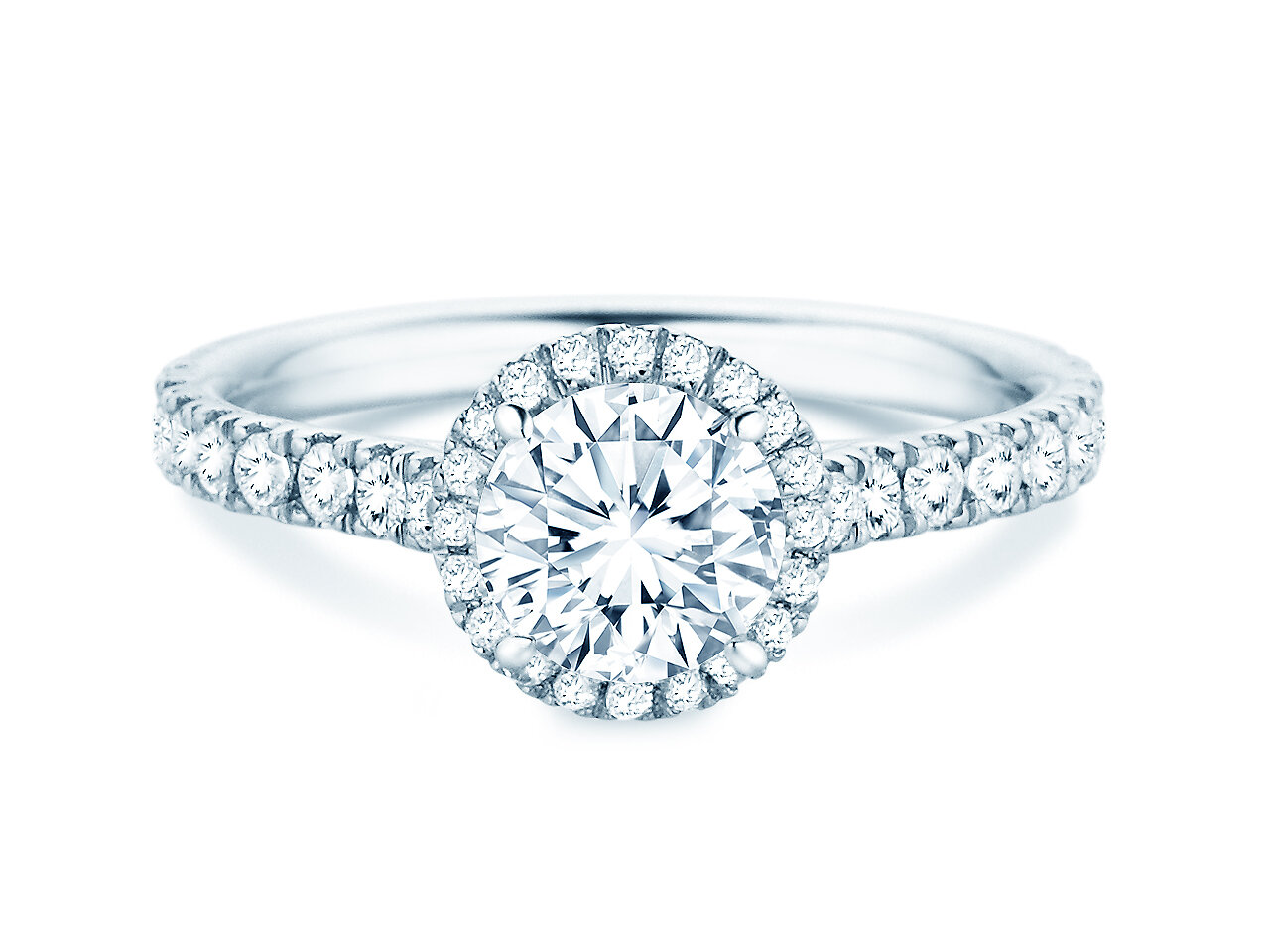 Le diamant rond finement taillé, mi-carat, étincelle clairement au centre de cette formidable bague. Entourée d'une couronne et soutenue d'un rail de diamants, ce bijou crée un rayonnement d'une élégance exquise et classique.