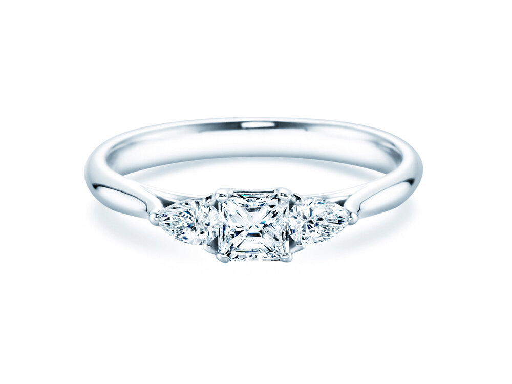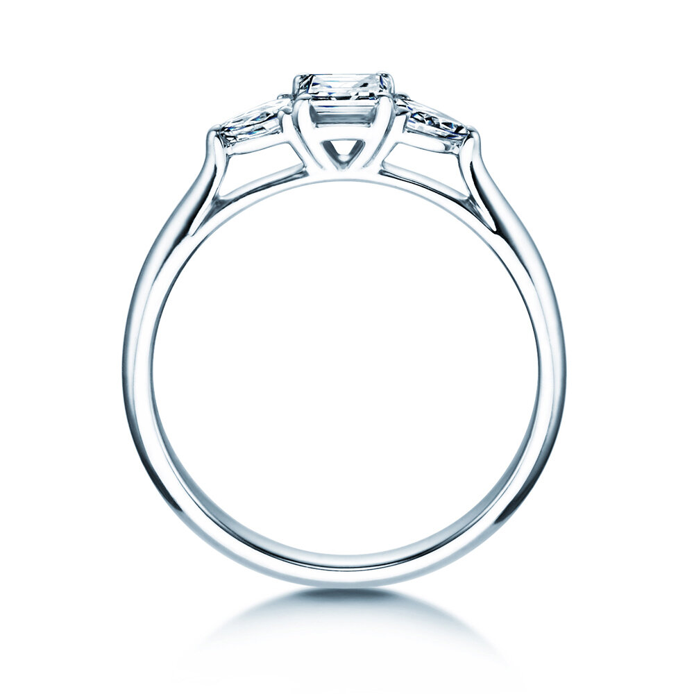 Une bague extraordinaire avec trois diamants exceptionnels. Deux diamants en forme de goutte ornent magnifiquement la pierre principale de taille Asscher. Avec ses trois diamants, le modèle Vivid Asscher se présente paré d'un éclat unique.